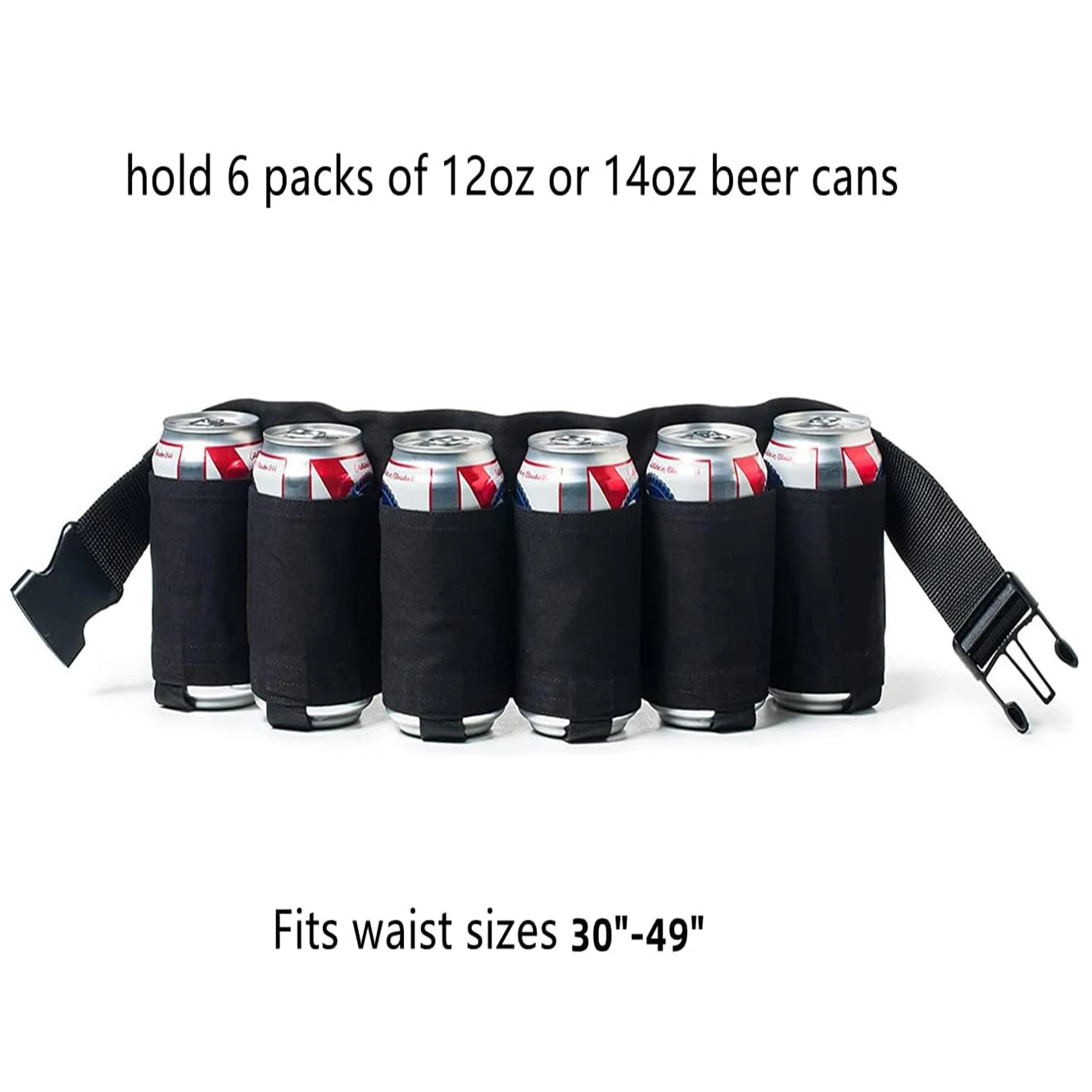 12oz or 14oz beer cans and soda bottles, adjustable strap with buckle,