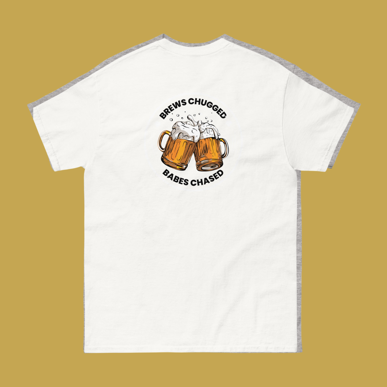 Turn heads and spark conversations with our Brews Chugged, Babes Chased T-shirt! Designed for the ultimate beer lover and socialite, this white tee blends a playful attitude with classic comfort. Perfect for a night out, a casual day with friends, or just showing off your fun side, this shirt embodies the spirit of adventure and festival.