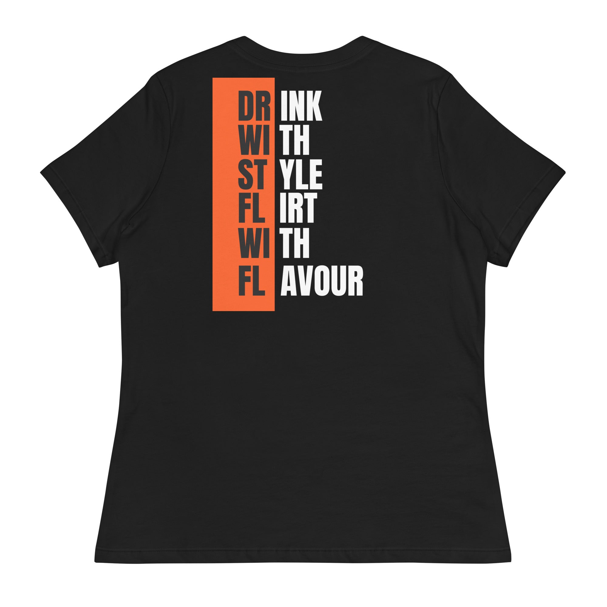 Elevate your wardrobe and societal status with the brand new Drink in Style, Flirt with Flavor T-shirt in sleek black! Perfect for women who blend sophistication with a playful edge, this tee is designed for those who love to make a statement while enjoying life's finer moments. Ideal for nights out, casual gatherings, or simply adding a touch of chic to your everyday wear.